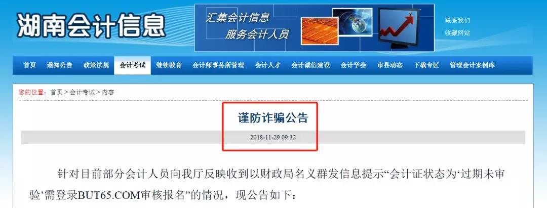 針對(duì)目前部分會(huì)計(jì)人員向湖南省財(cái)政廳反映收到以財(cái)政局名義群發(fā)信息提示“會(huì)計(jì)證狀態(tài)為‘過(guò)期未審驗(yàn)’需登錄BUT65.COM審核報(bào)名”的情況,現(xiàn)公告如下: